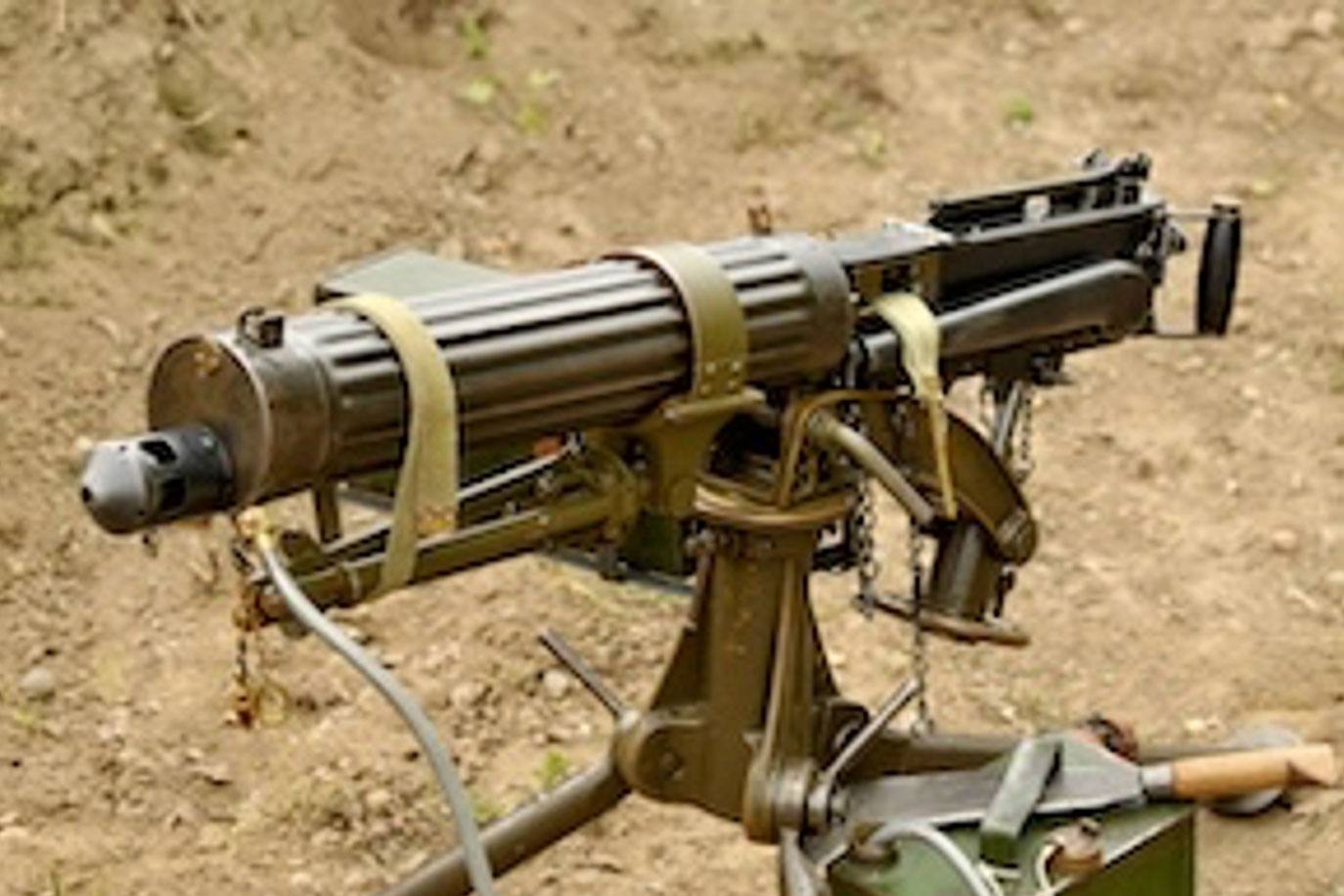 A good shot of the famous Lewis gun. This one has the earlier 47-round ammo drum, which was later supplanted by the 97-round “double stacked” drum. The Lewis was used by Allied observers, usually sitting in the back seat of an aircraft, although in some aircraft the Lewis was fixed to fire forward above the propeller arc. Unlike the Vickers, the Lewis could not be synchronized to fire through the propeller arc.