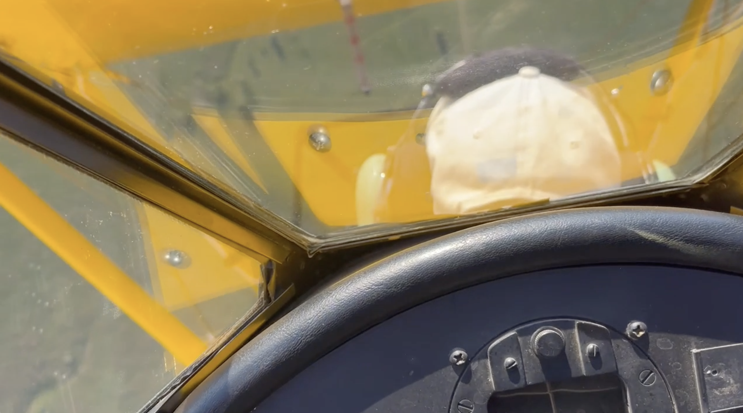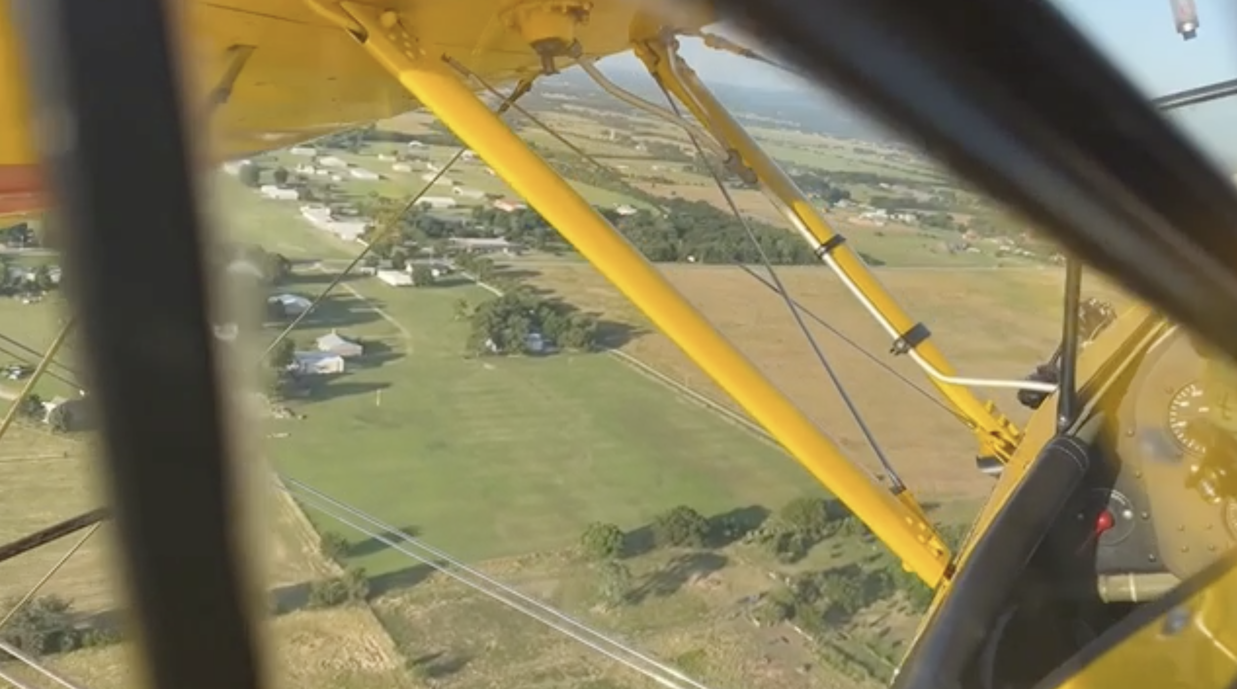 This is your basic traffic pattern and landing onto a grass strip. The final approach is very steep by airline pilot standards, due to the high drag of the Stearman. It’s easier to land on grass—more forgiving of yaw inputs than is a concrete runway.